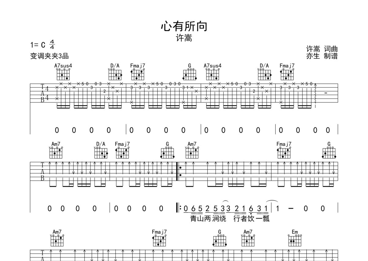 许嵩《心有所向》吉他谱 - C调弹唱六线谱