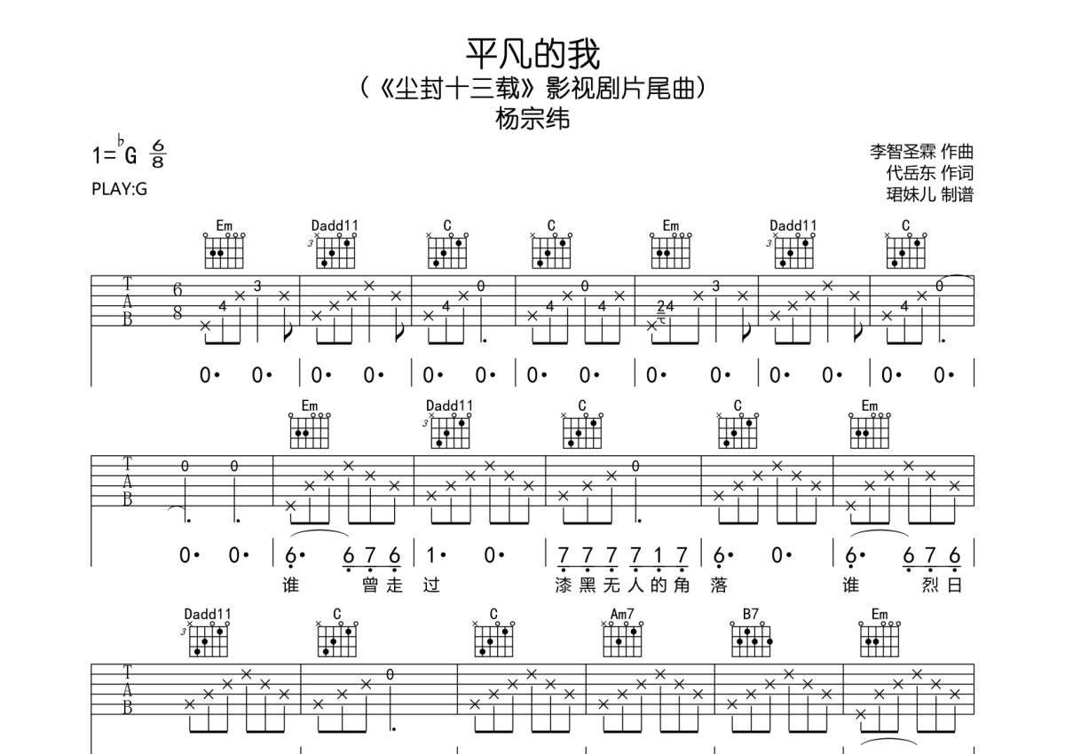 《平凡的我》是杨宗纬演唱的一首歌曲,本吉他谱采用的是G调指法编配,这份吉他谱共有三张高清图谱,图谱由 @珺妹儿 编配上传,图谱使用六线谱编配,包含吉他和弦指法、简谱以及歌词部分,使用这份平凡的我吉他谱,可以让你更加方便地掌握这首歌曲的弹唱技巧,快来尝试吧。(《尘封十三载》影视剧片尾曲),用G调指法编,速度85难度较简单,易上手。