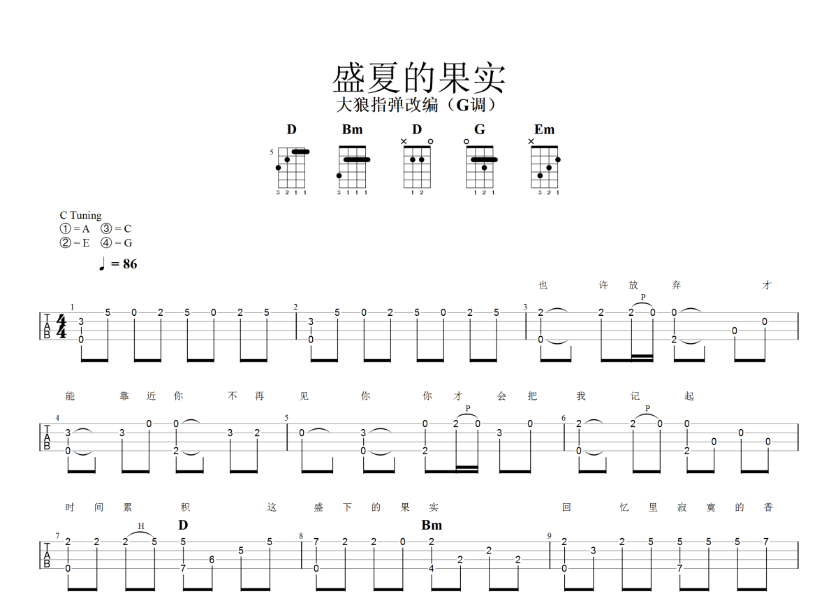 《盛夏的果实》是莫文蔚演唱的一首歌曲,指弹,本尤克里里谱采用的是G调指法编配,这份尤克里里谱共有三张高清图谱,图谱由 @大狼指弹 编配上传,图谱使用四线谱编配,曲谱配备了相关的音频提供试听,使用这份盛夏的果实尤克里里谱,可以让你更加方便地掌握这首歌曲的演奏技巧,快来尝试吧。盛夏的果实尤克里里指弹独奏曲谱,G调指法编配。