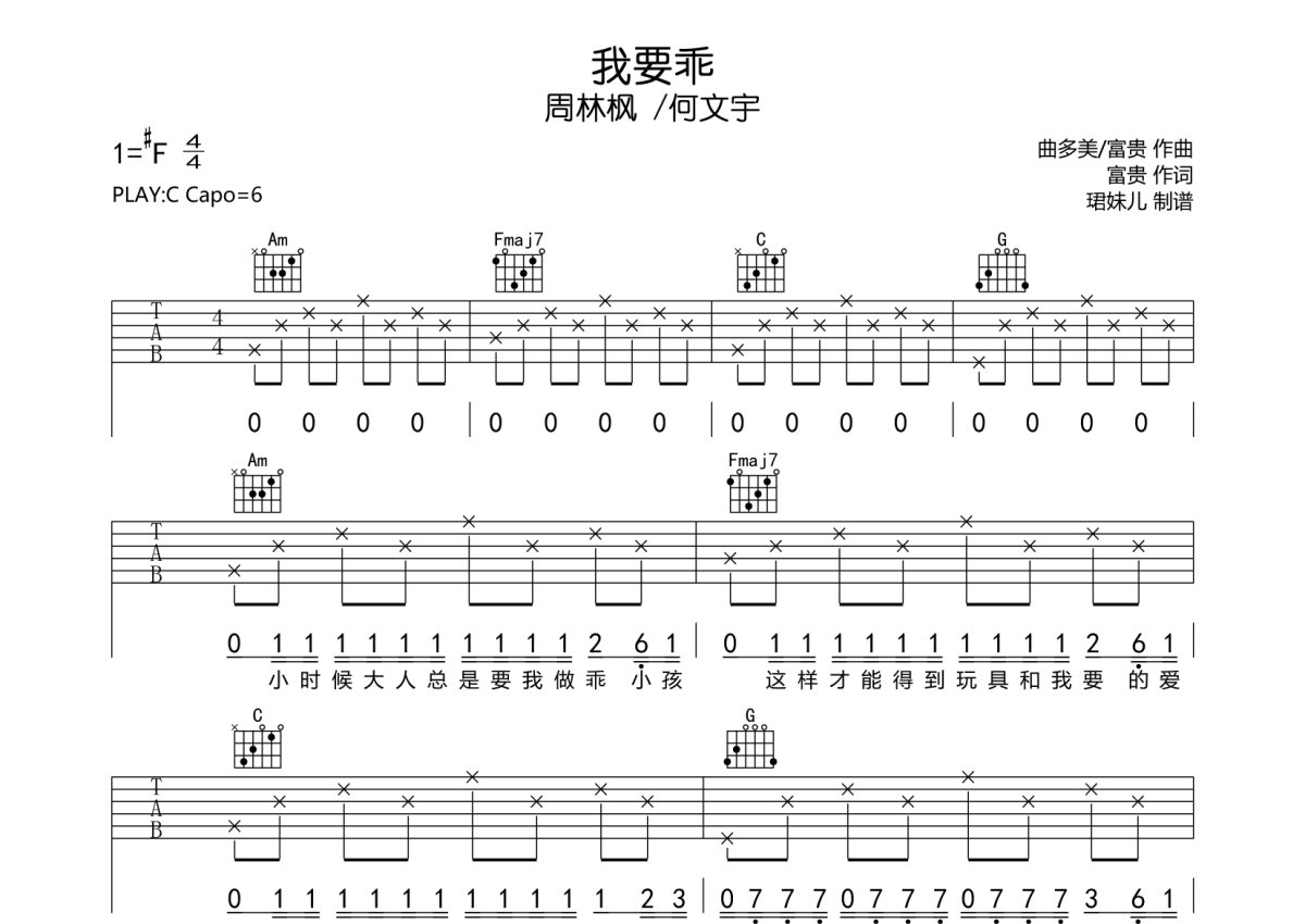 周林枫 /何文宇《我要乖》吉他谱 - C调弹唱六线谱