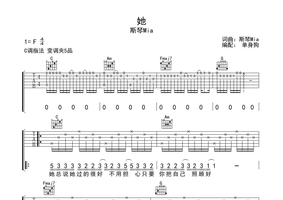 斯琴Mia《她》吉他谱 - C调弹唱六线谱