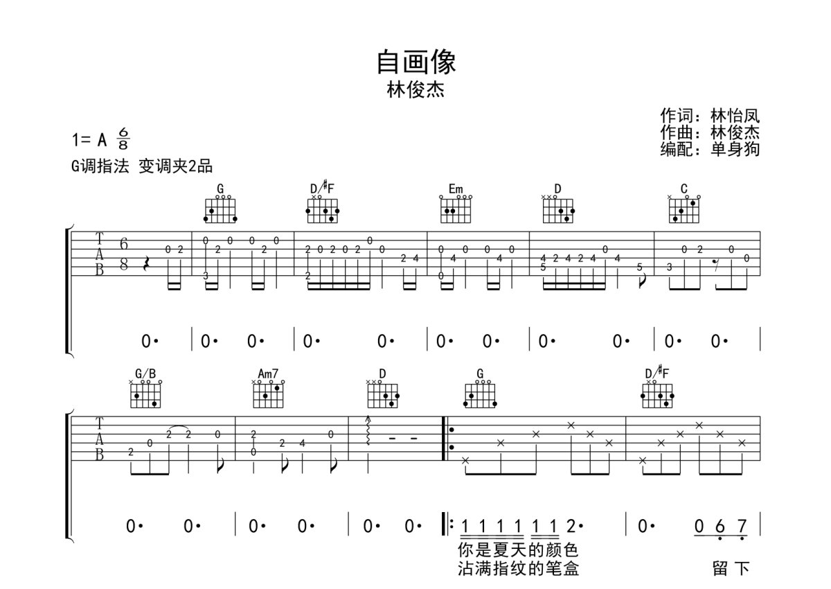 林俊杰《自画像》吉他谱 - G调弹唱六线谱