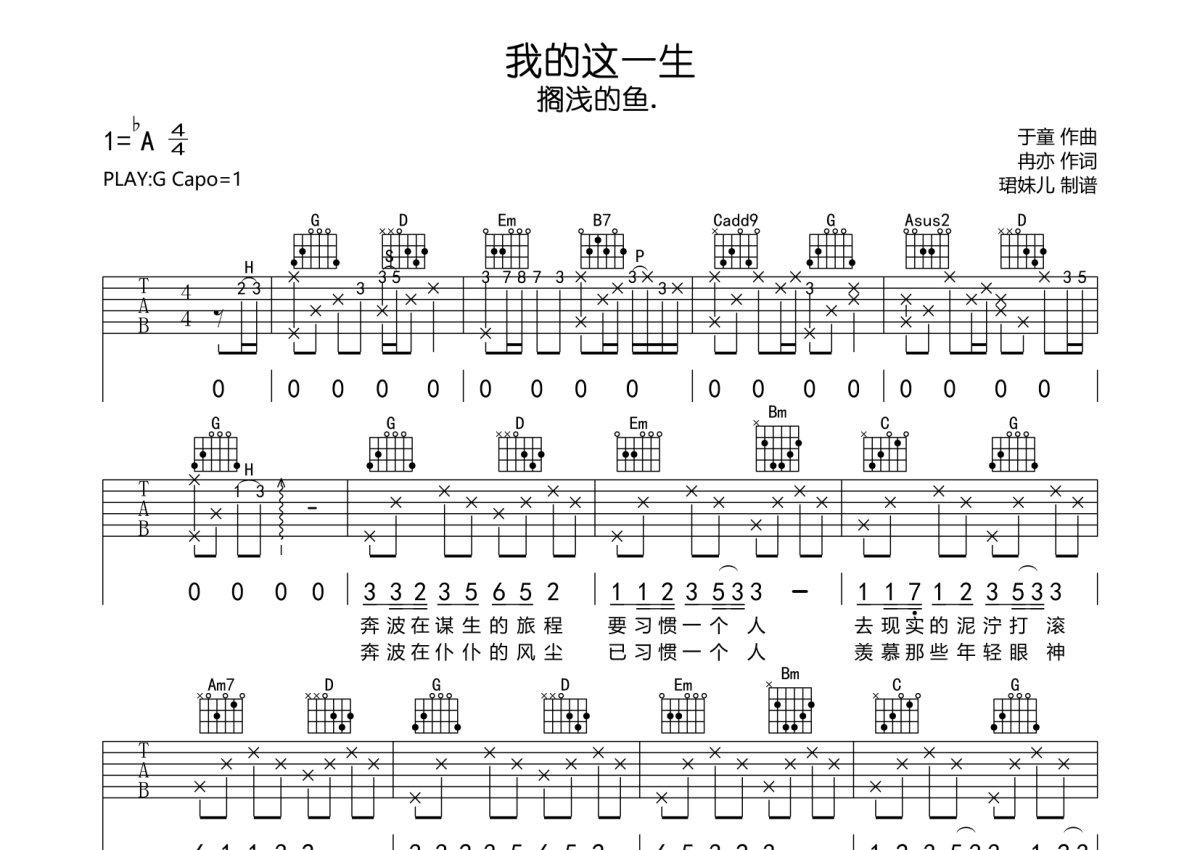 《我的这一生》是搁浅的鱼.演唱的一首歌曲,本吉他谱采用的是C调指法编配,这份吉他谱共有两张高清图谱,图谱由 @珺妹儿 编配上传,图谱使用六线谱编配,包含吉他和弦指法、简谱以及歌词部分,使用这份我的这一生吉他谱,可以让你更加方便地掌握这首歌曲的弹唱技巧,快来尝试吧。用G调指法编,弹唱建议变调夹1品,速度85难度较简单,易上手。