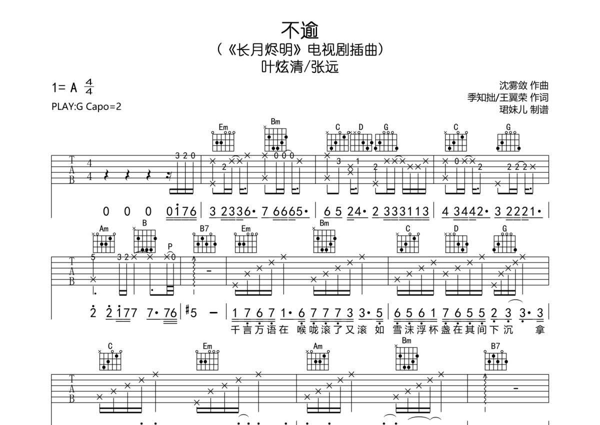 叶炫清/张远《不逾》吉他谱 - G调弹唱六线谱