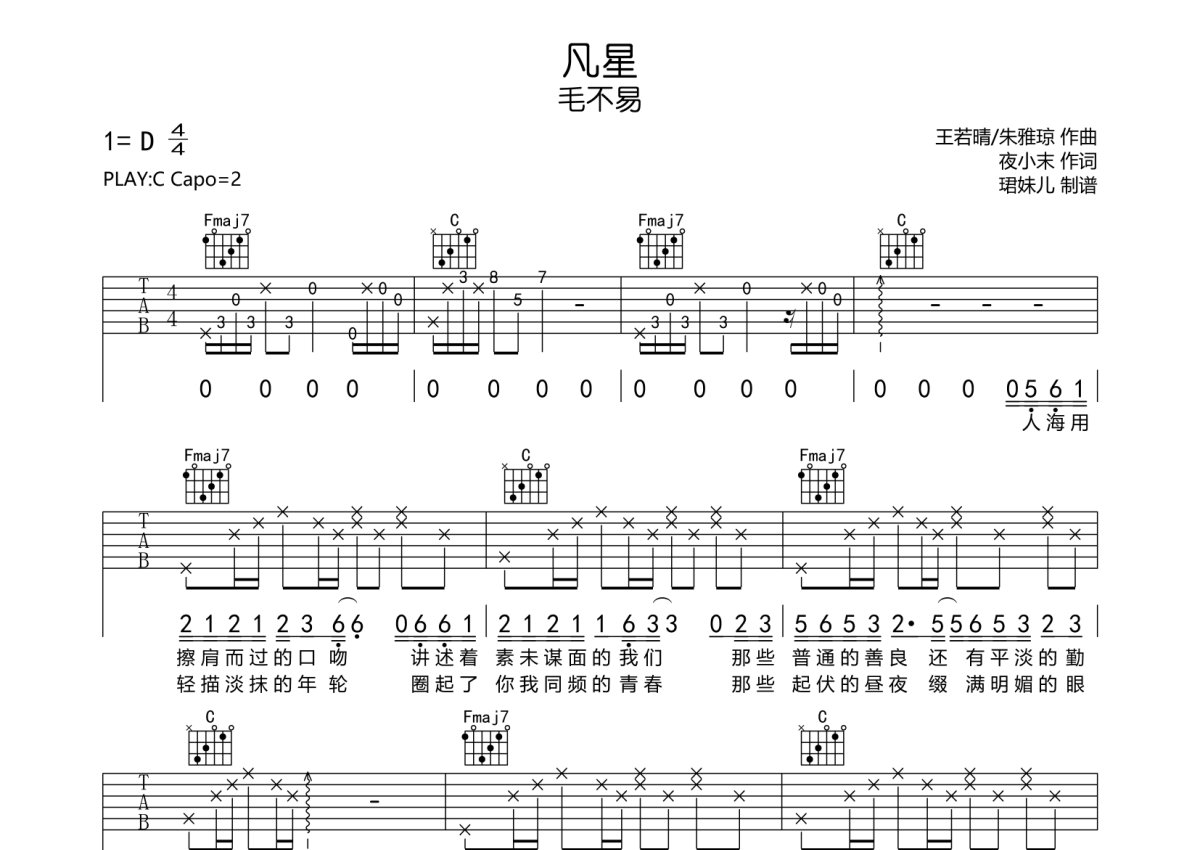 毛不易《凡星》吉他谱 - C调弹唱六线谱