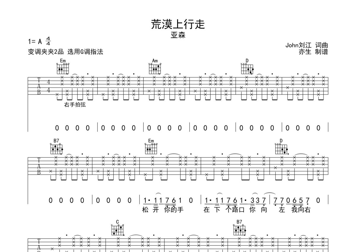 亚森《荒漠上行走》吉他谱 - G调弹唱六线谱