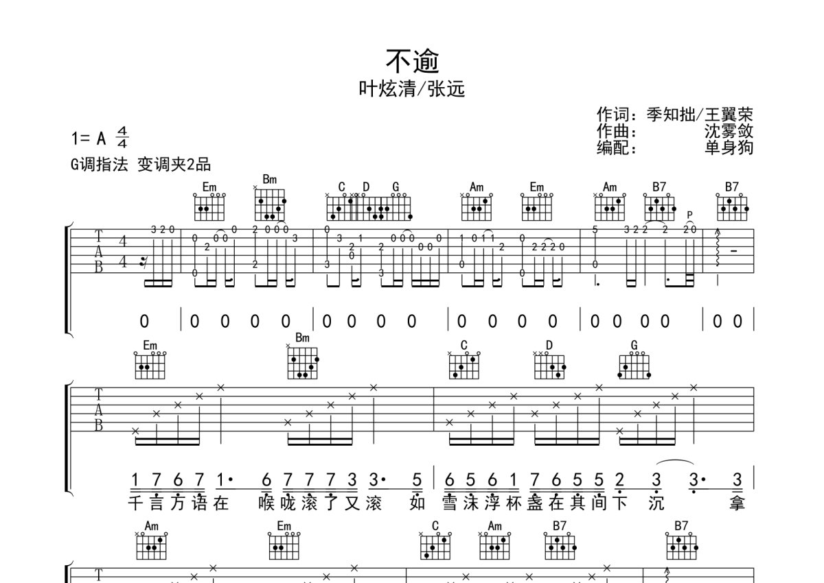 叶炫清/张远《不逾》吉他谱 - G调弹唱六线谱