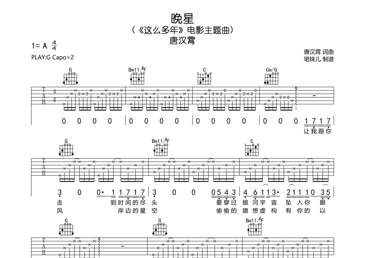 唐汉霄《晚星》吉他谱 - G调弹唱六线谱