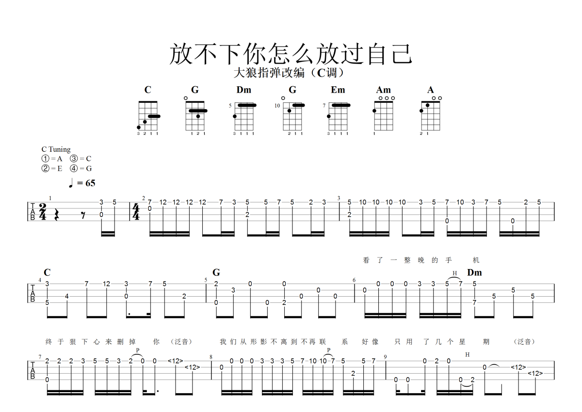 大潞《放不下你怎么放过自己》尤克里里谱 - C调尤克里里谱 - 指弹