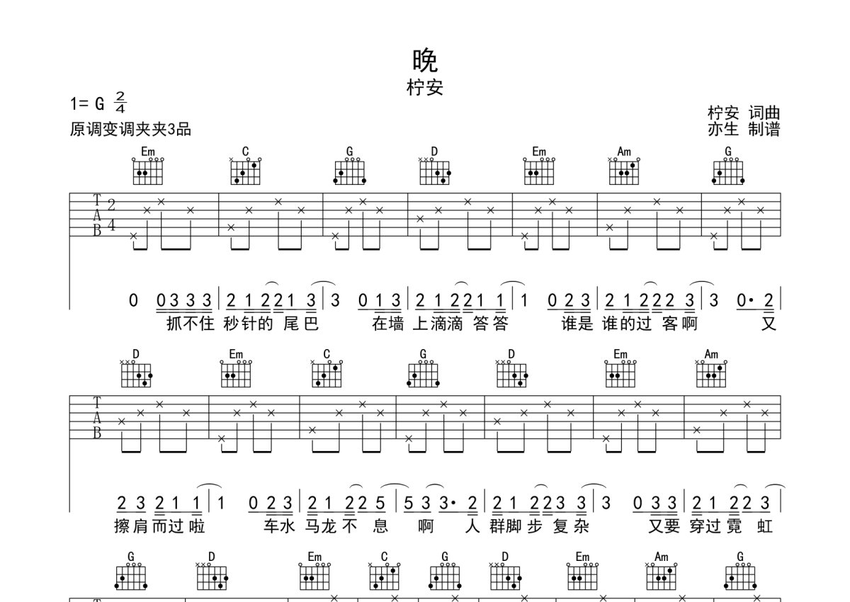 柠安《晚》吉他谱 - G调弹唱六线谱