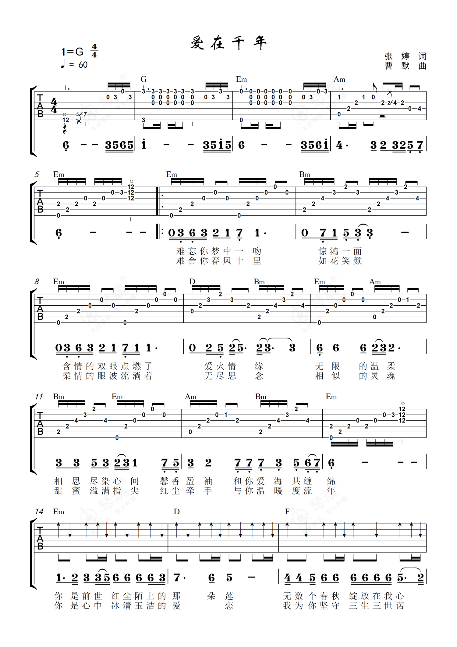 曹默《爱在千年》吉他谱 - G调弹唱六线谱