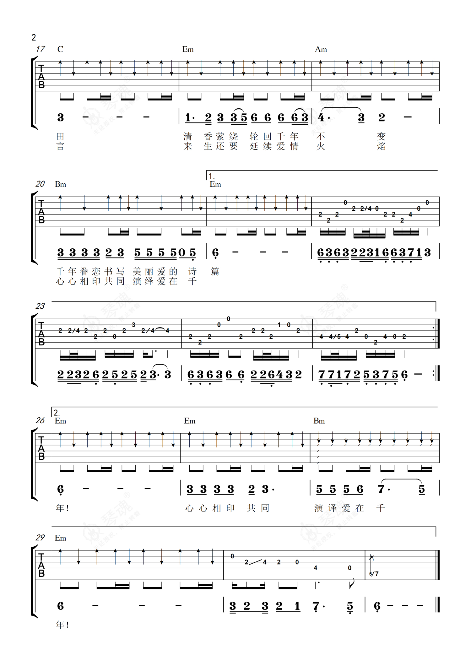 《爱在千年》是曹默演唱的一首歌曲,本吉他谱采用的是G调指法编配,这份吉他谱共有两张高清图谱,图谱由 @曹默 编配上传,图谱使用六线谱编配,包含吉他和弦指法、简谱以及歌词部分,使用这份爱在千年吉他谱,可以让你更加方便地掌握这首歌曲的弹唱技巧,快来尝试吧。