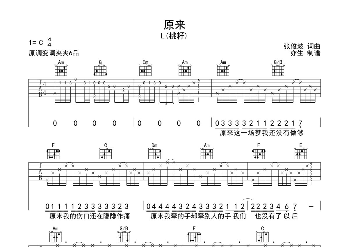 L(桃籽)《原来》吉他谱 - C调弹唱六线谱