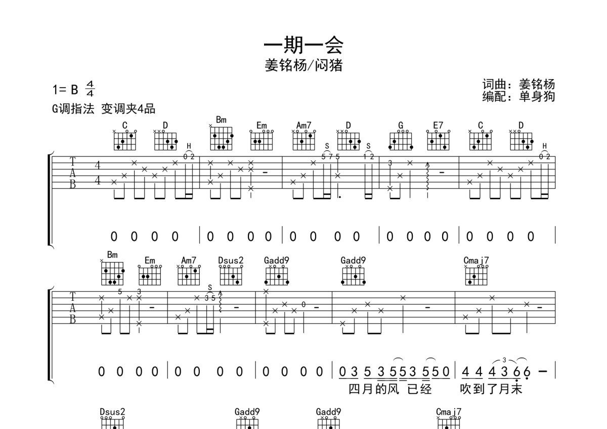 姜铭杨/闷猪《一期一会》吉他谱 - G调弹唱六线谱