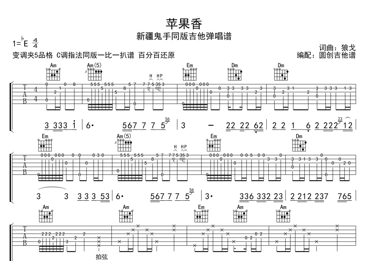 新疆鬼手《苹果香》吉他谱 - C调弹唱六线谱 - 轮指版带视频教学