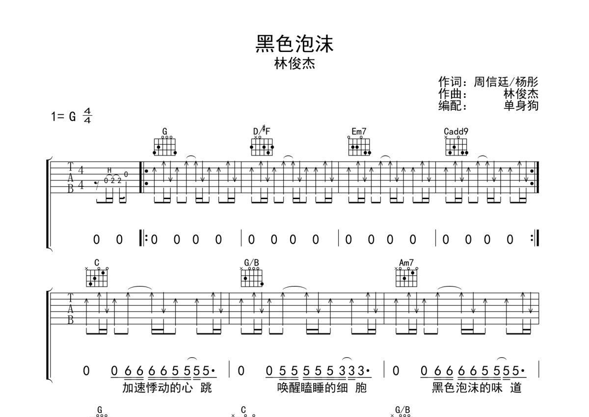 林俊杰《黑色泡沫》吉他谱 - G调弹唱六线谱