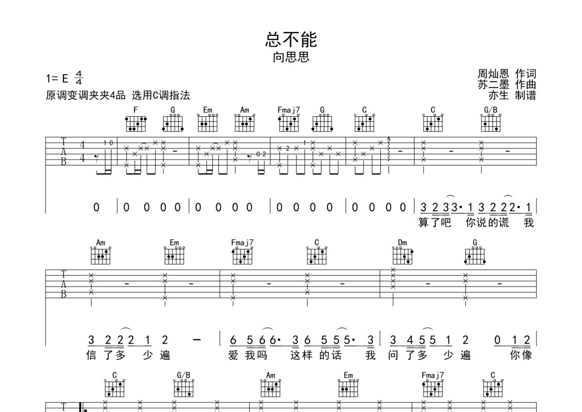 向思思《总不能》吉他谱 - C调弹唱六线谱