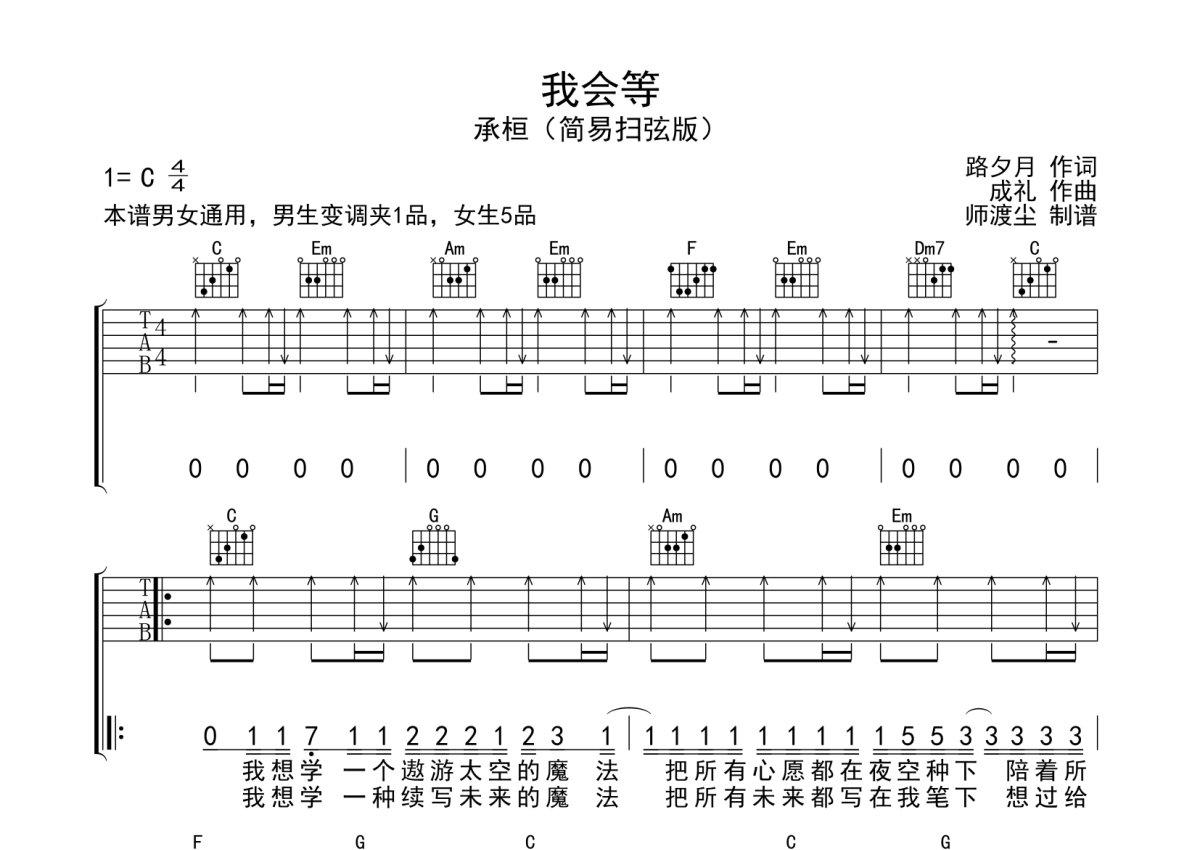 《我会等》是承桓演唱的一首歌曲,男女通用扫弦版,本吉他谱采用的是C调指法编配,这份吉他谱共有两张高清图谱,图谱由 @师渡尘 编配上传,图谱使用六线谱编配,包含吉他和弦指法、简谱以及歌词部分,使用这份我会等吉他谱,可以让你更加方便地掌握这首歌曲的弹唱技巧,快来尝试吧。我会等C调男女通用扫弦版吉他谱,承桓演唱,师渡尘制谱。男生变调夹1品演唱,女生夹5品。