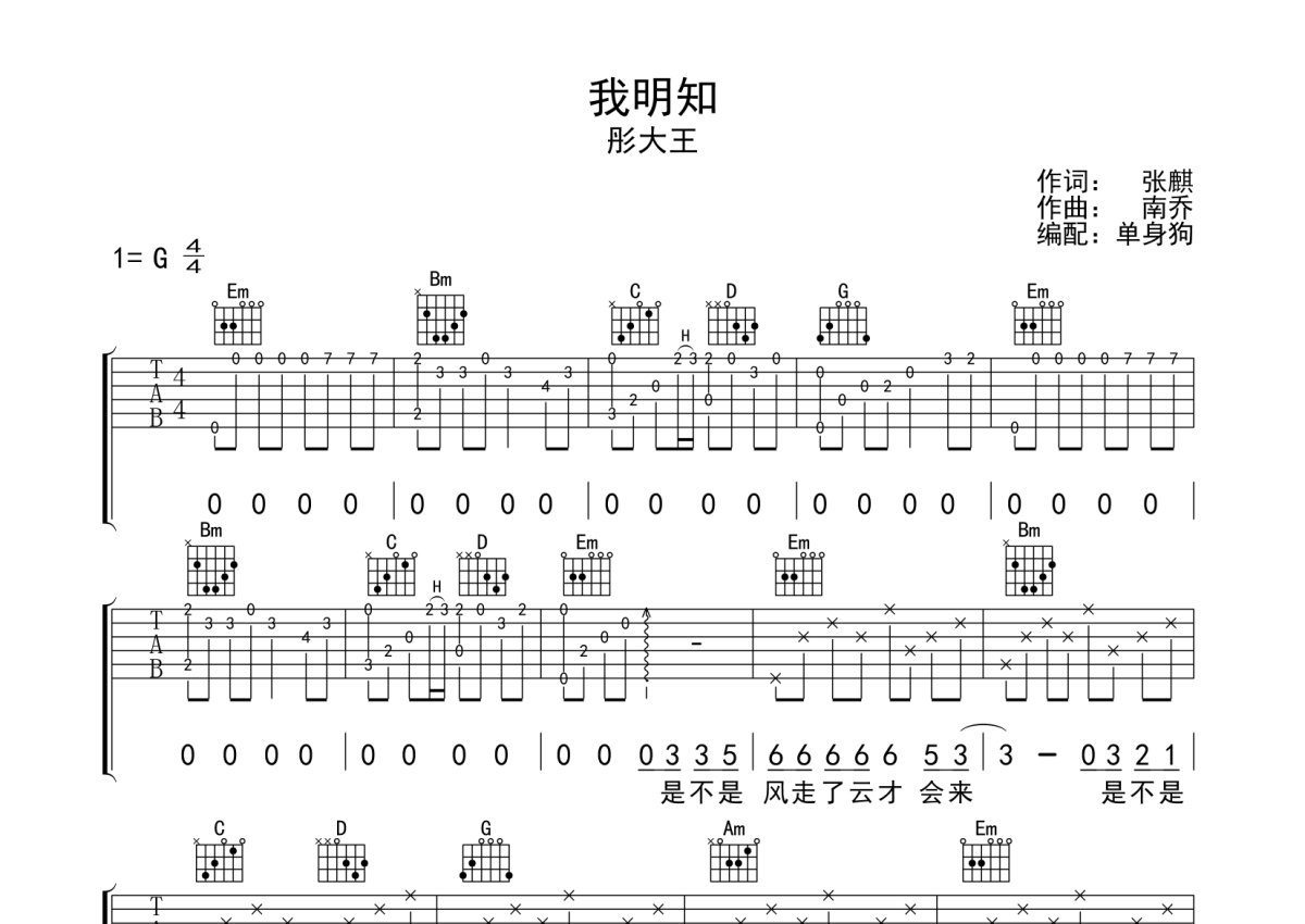 彤大王《我明知》吉他谱 - G调弹唱六线谱