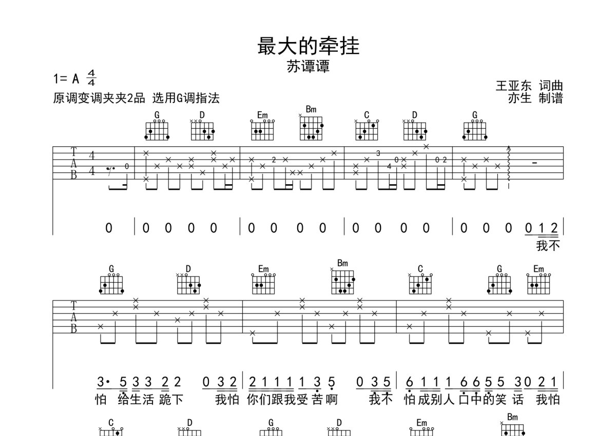 苏谭谭《最大的牵挂》吉他谱 - G调弹唱六线谱