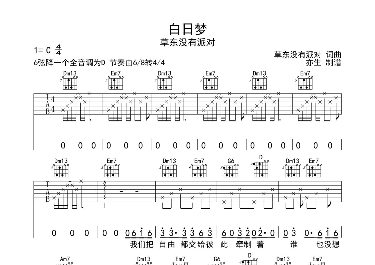 草东没有派对《白日梦》吉他谱 - C调弹唱六线谱