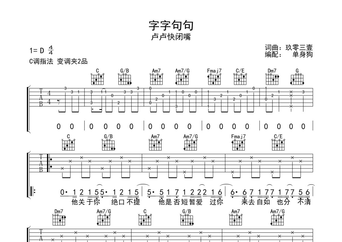 卢卢快闭嘴《字字句句》吉他谱 - C调弹唱六线谱