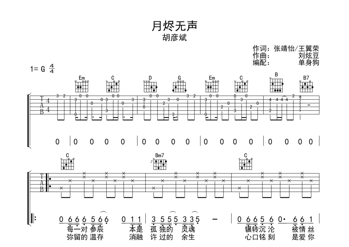 胡彦斌《月烬无声》吉他谱 - G调弹唱六线谱