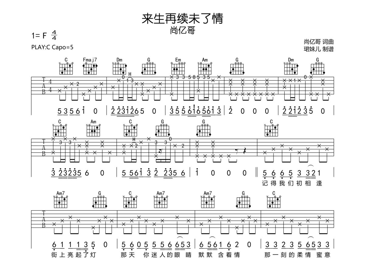 尚亿哥《来生再续未了情》吉他谱 - C调弹唱六线谱