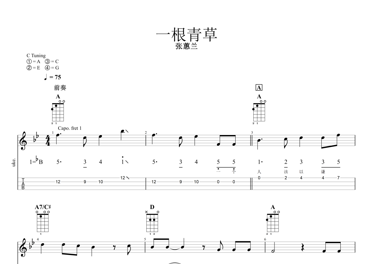 张蕙兰《一根青草》尤克里里谱 - A调尤克里里谱