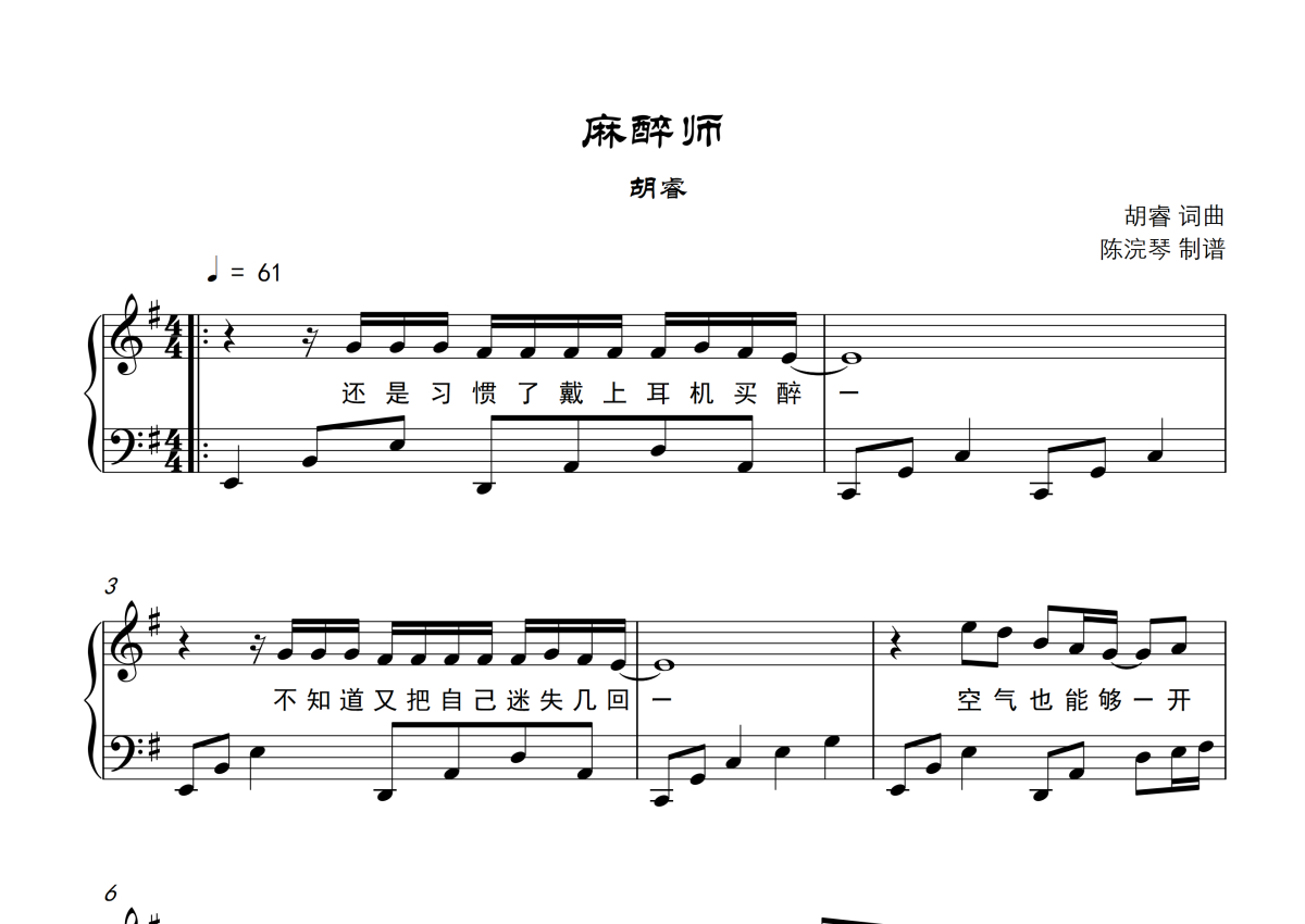 胡睿《麻醉师》钢琴谱 - G调钢琴谱,附歌词