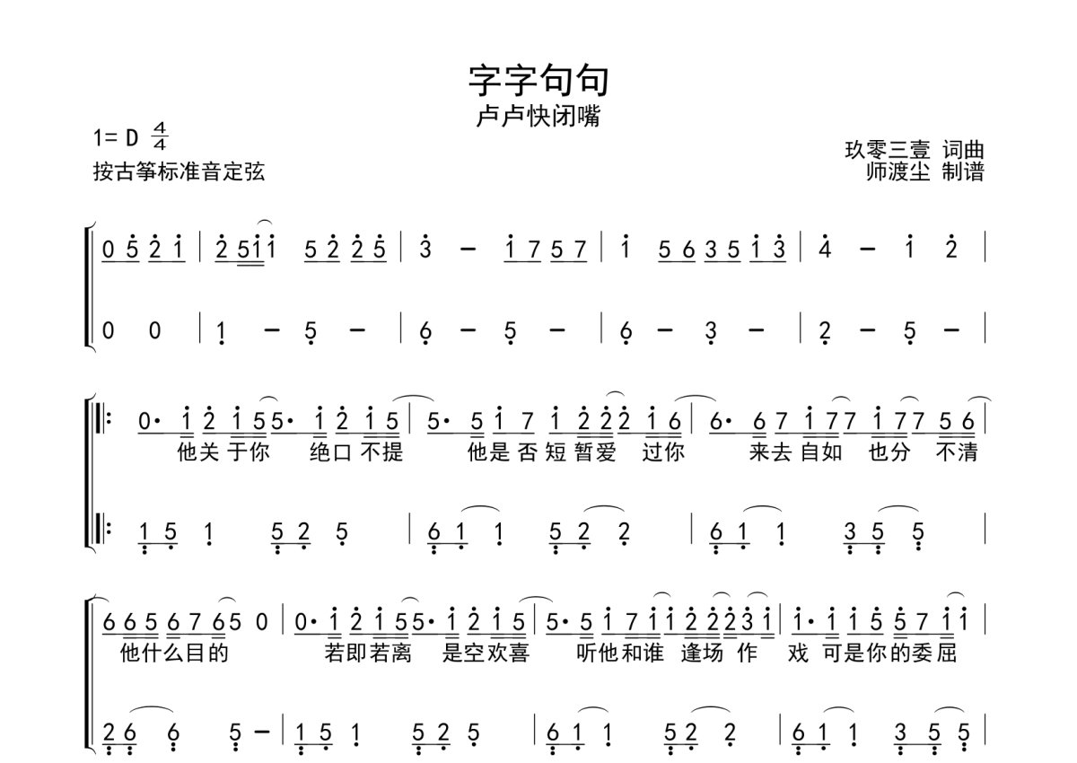 《字字句句》是卢卢快闭嘴演唱的一首歌曲,这份古筝谱共有两张高清图谱,图谱由 @师渡尘 编配上传。