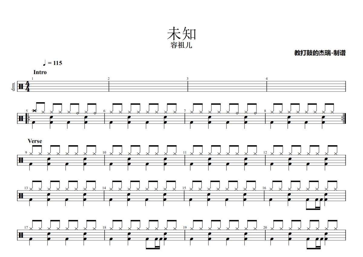 《未知》是容祖儿演唱的一首歌曲,这份鼓谱共有两张高清图谱,图谱由 @Jerry 编配上传,图谱使用五线谱编配,使用这份未知架子鼓谱,你将能够轻松地敲打出这首容祖儿的未知,快来尝试吧。