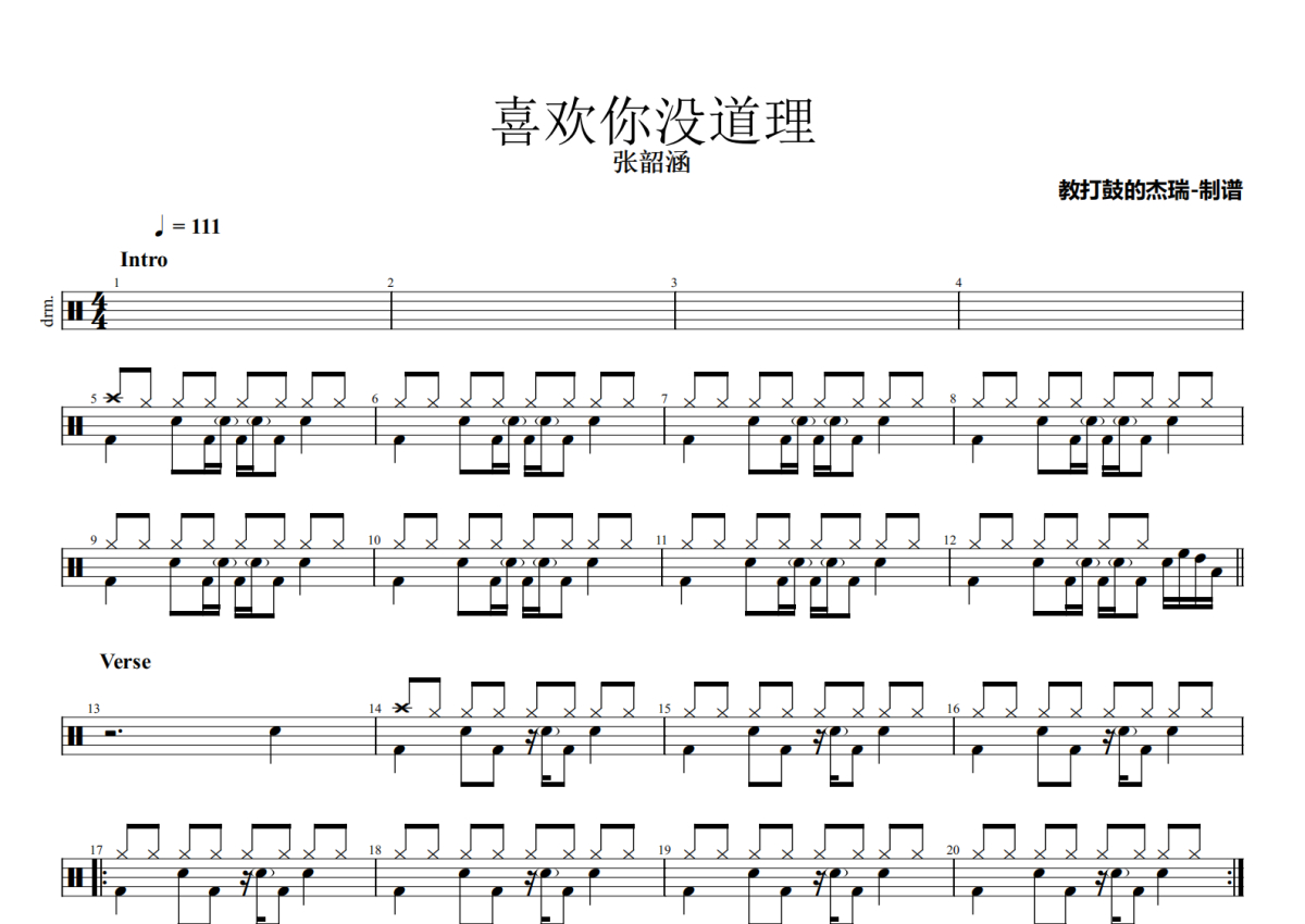 张韶涵《喜欢你没道理》鼓谱 - 架子鼓谱