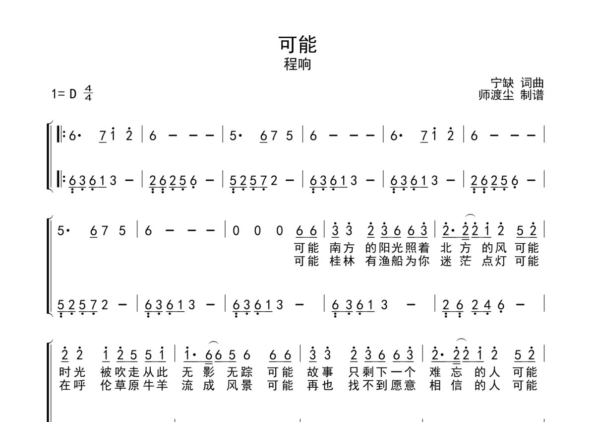 《可能》是程响演唱的一首歌曲,数字双手简谱,这份钢琴谱共有两张高清图谱,图谱由 @师渡尘 编配上传,曲谱配备了相关的音频提供试听,使用这份可能钢琴谱,可以让你更加方便地掌握这首歌曲的演奏技巧,快来尝试吧。钢琴五线谱。