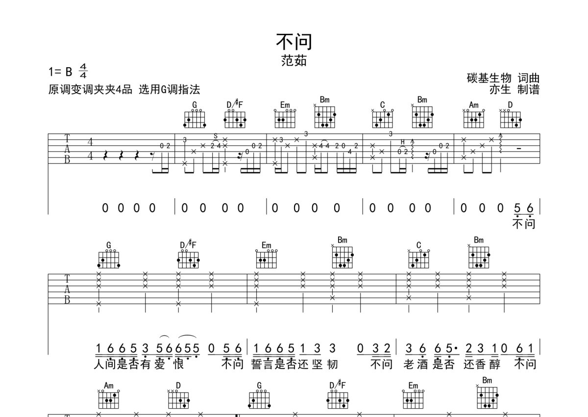 范茹《不问》吉他谱 - G调弹唱六线谱