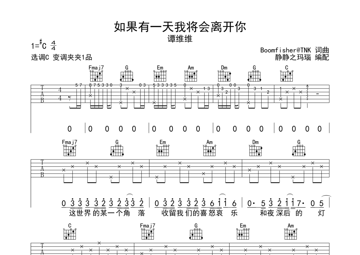 谭维维《如果有一天我将会离开你》吉他谱 - C调弹唱六线谱
