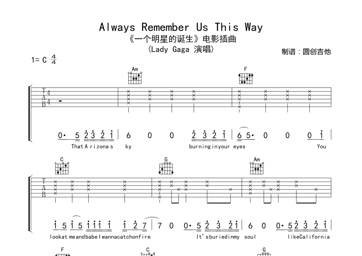 Lady Gaga《Always Remember Us This Way》吉他谱 - C调弹唱六线谱 - 《一个明星的诞生》电影插曲