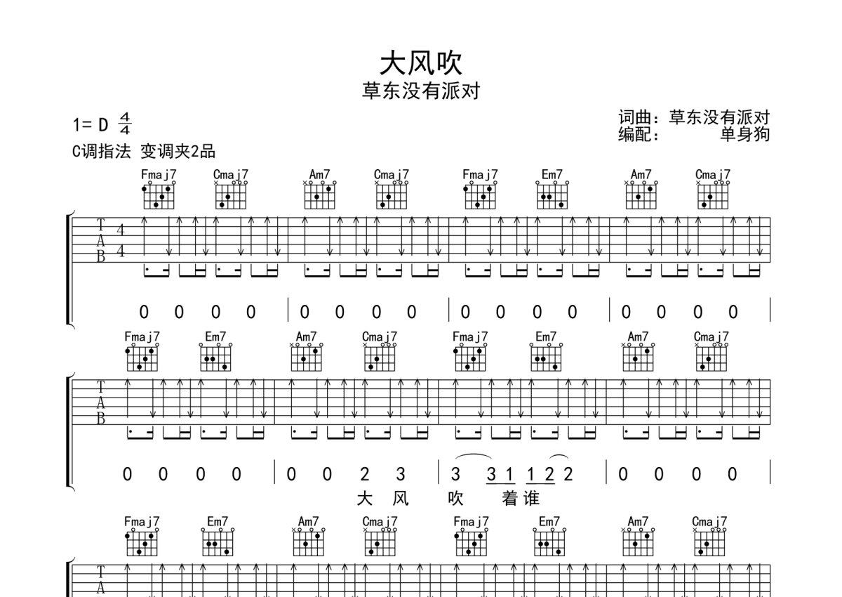 草东没有派对《大风吹》吉他谱 - C调弹唱六线谱