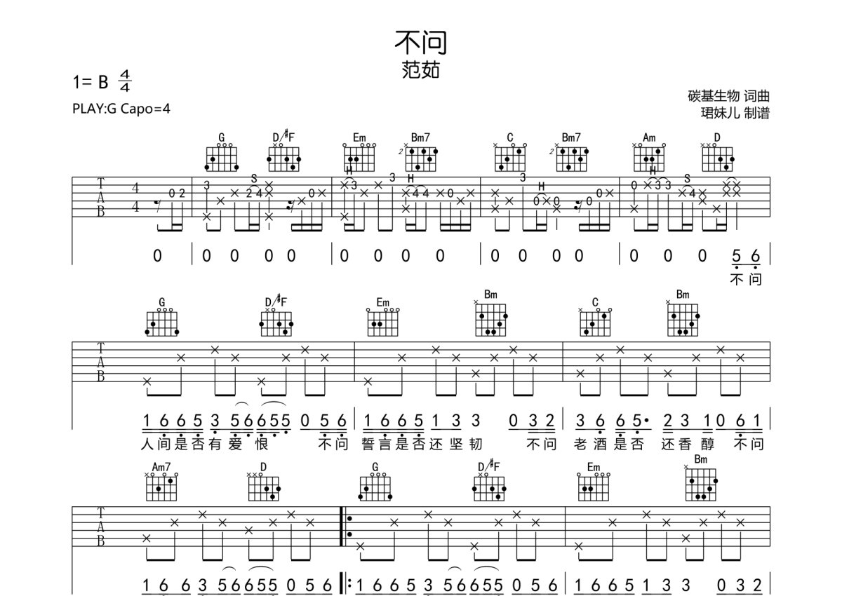 范茹《不问》吉他谱 - G调弹唱六线谱