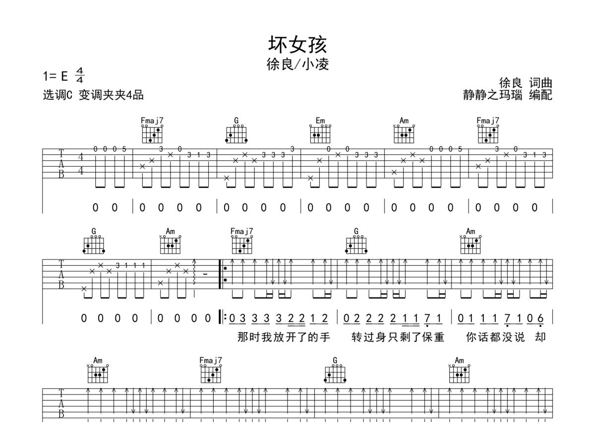 徐良/小凌《坏女孩》吉他谱 - C调弹唱六线谱