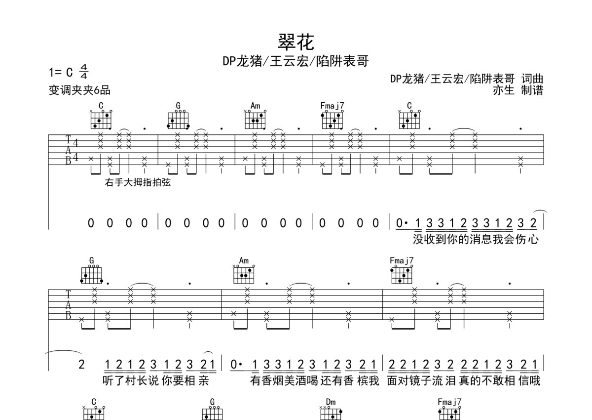 DP龙猪/王云宏/陷阱表哥《翠花》吉他谱 - C调弹唱六线谱