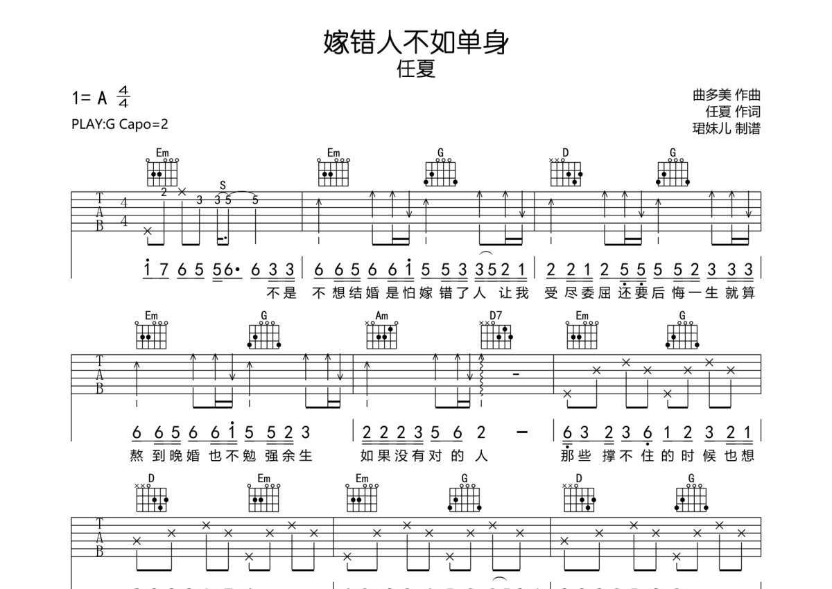任夏《嫁错人不如单身》吉他谱 - G调弹唱六线谱