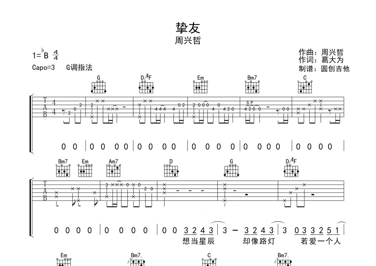 周兴哲《挚友》吉他谱 - G调弹唱六线谱 - 分解加扫弦编配原版编配