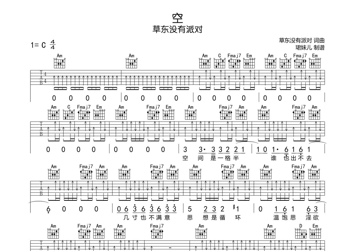 草东没有派对《空》吉他谱 - C调弹唱六线谱