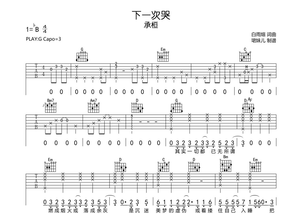 承桓《下一次哭》吉他谱 - G调弹唱六线谱