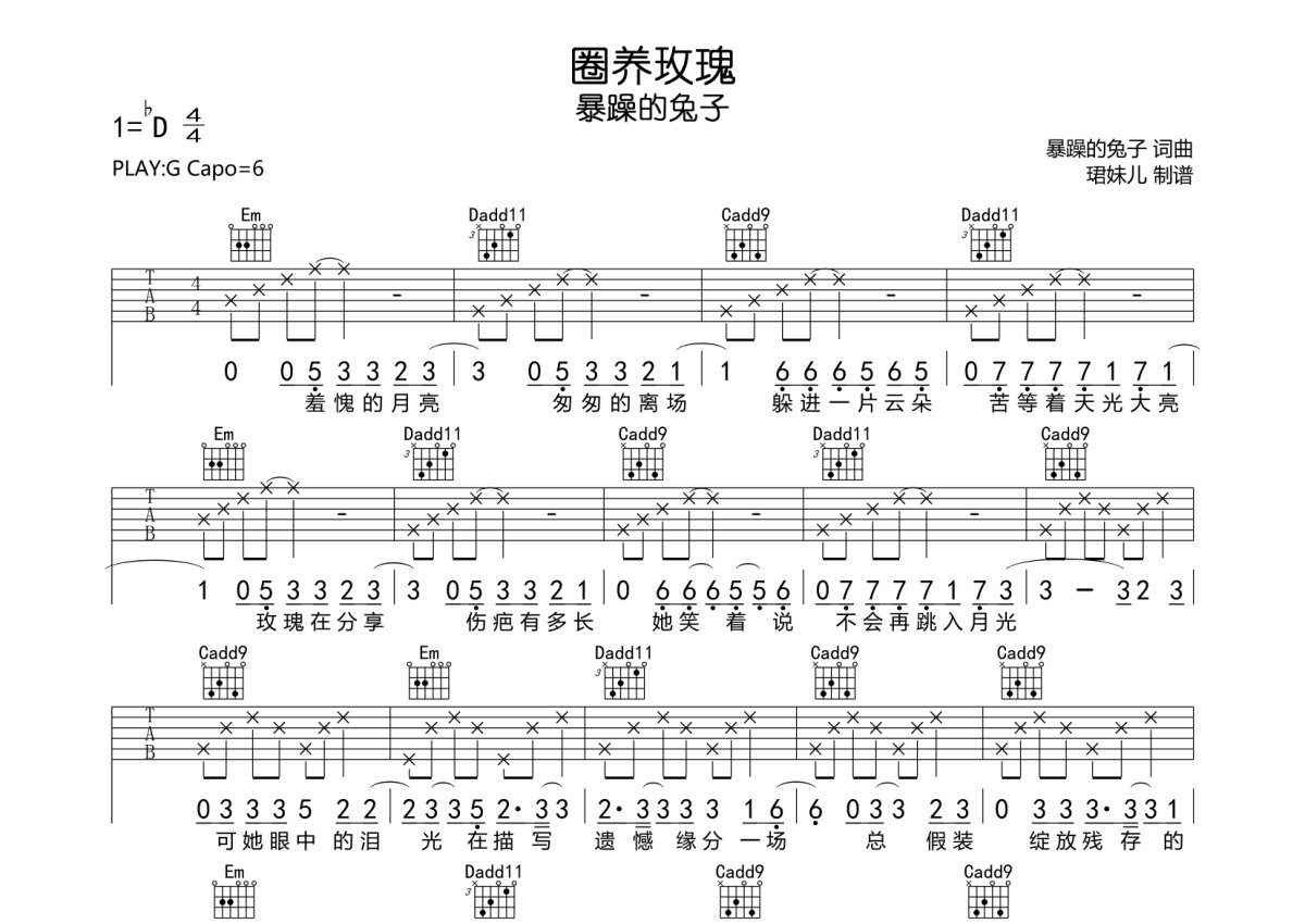 暴躁的兔子《圈养玫瑰》吉他谱 - G调弹唱六线谱