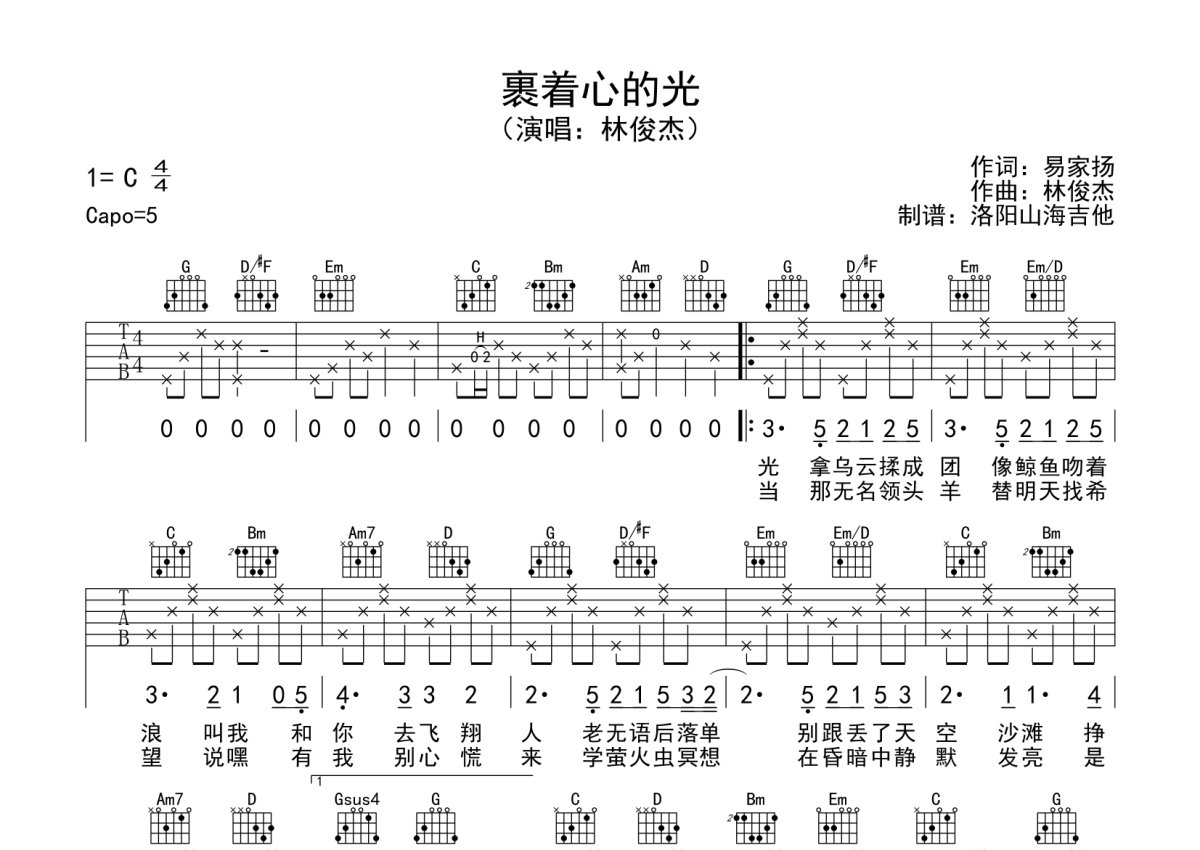 林俊杰《裹着心的光》吉他谱 - C调弹唱六线谱