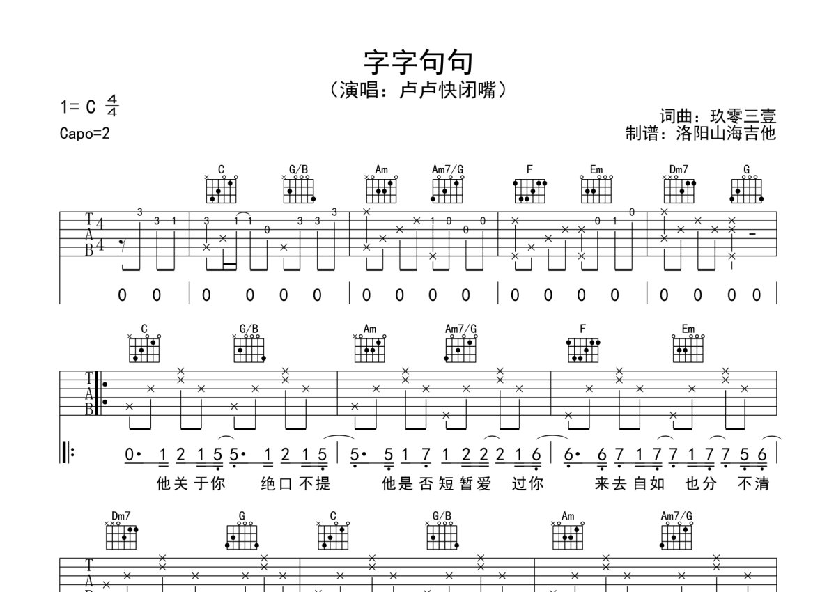 卢卢快闭嘴《字字句句》吉他谱 - C调弹唱六线谱