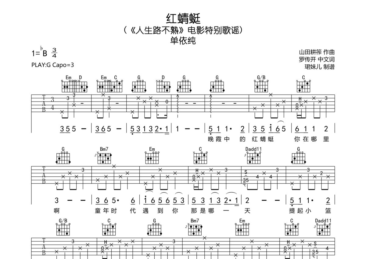 单依纯《红蜻蜓》吉他谱 - G调弹唱六线谱