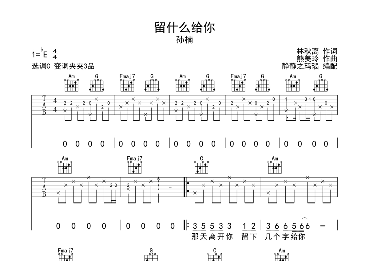 《留什么给你》是孙楠演唱的一首歌曲,本吉他谱采用的是C调指法编配,这份吉他谱共有两张高清图谱,图谱由 @静待花开 编配上传,图谱使用六线谱编配,包含吉他和弦指法、简谱以及歌词部分,使用这份留什么给你吉他谱,可以让你更加方便地掌握这首歌曲的弹唱技巧,快来尝试吧。本谱采用C调和弦指法编配,节奏为4/4拍,速度为85拍每分钟,弹唱建议变调夹夹3品,也可以根据个人嗓音找到一个舒服的位置,难度初级。